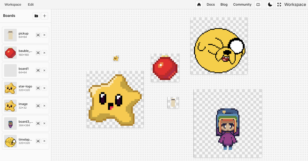 Unlike traditional editors with fixed canvases, Novaboard gives you an infinite workspace where you can organize all your sprites, characters, and tilesets in one place. Think of it like having a giant desk where you can spread out all your work.